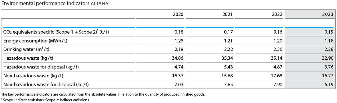 The ALTANA Group measures progress in the area of environmental protection using specific key performance indicators. In addition to the absolute values, the figures are set in relation to the quantity of produced finished goods. ALTANA sets annual upper limits for energy consumption, water consumption, and waste quantities in relation to produced finished goods. The development of these indicators is published in the document “Facts and Figures on Sustainability 2023.”