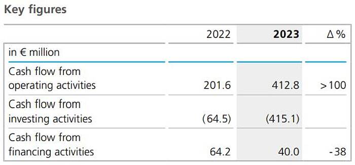 In the course of 2023, cash and cash equivalents increased by € 33.2 million to € 491.3 million (previous year: € 458.1 million). At € 412.8 million, the cash inflow from operating activities was well above the previous year’s 201.6 million) and in line with our expectations, which had forecast an improvement for 2023 compared to the previous year. This primarily reflects the release of capital in net working capital with a reduction € 90.5 million over the course of the year, in particular due to the sharp reduction in inventories.