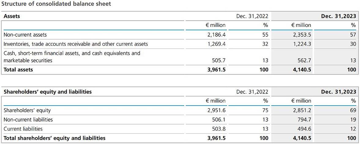 At the end of 2023, the balance sheet structure was significantly influenced by the inclusion of the Von Roll Group in the scope of consolidation. The ALTANA Group’s total assets rose from € 3,961.5 million in the previous year to € 4,140.5 million in 2023. The increase € 179.0 million or 5 % results primarily from an increase in non-current assets from this acquisition. Negative exchange-rate effects also impacted the balance sheet total.