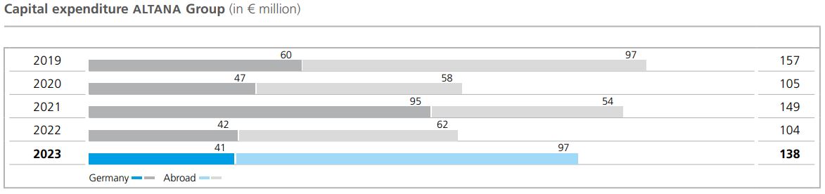 In 2023, € 10.0 million were attributable to subsequent payments in connection with the technology acquisition at ACTEGA in 2017. Adjusted for this payment, ALTANA invested a total 138.3 million in intangible assets and property, plant and equipment in the past fiscal year, thus exceeding the previous year’s figure (€ 103.5 million). The investment ratio, that is the ratio of investments to sales, was 5.0 % and thus within our long-term target range of 5 % to 6 %.