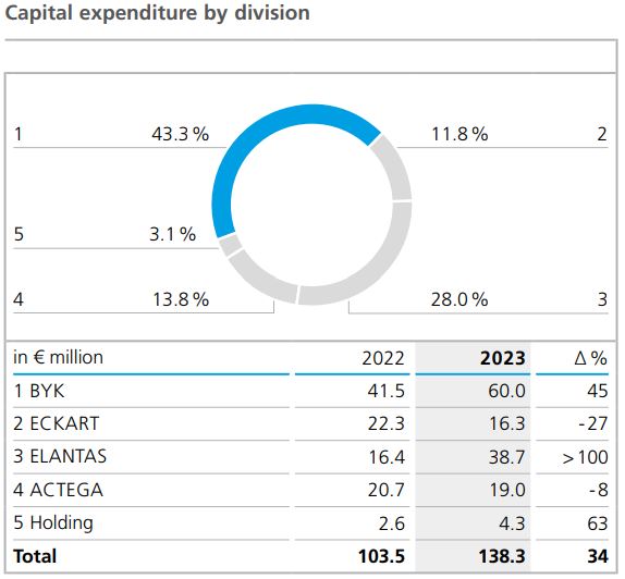 The BYK division invested a total of € 60.0 million in 2023, significantly above the previous year’s level (€ 41.5 million). Investment activities focused on the further expansion of production capacities in the U.S. and Germany. Other investments concerned research and development capacities as well as strategic digitalization projects.