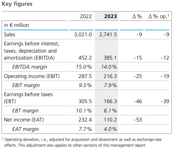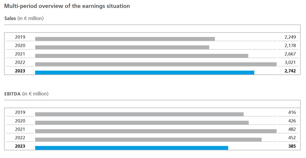 The persistent economic strain resulting from ongoing geopolitical crises has precipitated a pronounced decrease in demand for our products over six consecutive quarters. Despite initial hesitancy from our customers in reducing inventories amassed in prior periods to safeguard production, the anticipated uptick in demand for the second half of 2023 failed to materialize. Consequently, there was an overall decline in volumes by 8 %. Additionally, marginal declines in raw material and energy prices within specific product segments led to reductions in our sales prices, further contributing to the negative impact on sales development. Regrettably, the initially forecasted sales growth for 2023 in the mid single-digit percentage range could not be realized.
