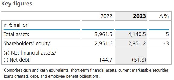 The balance of cash and cash equivalents, short-term financial assets, current marketable securities, loans granted, financial liabilities, and employee benefit obligations resulted in net financial assets of € - 51.8 million at the balance sheet date of December 31, 2023. This corresponds to a decrease of € 196.5 million compared with the previous year (net financial assets € 144.7 million), due in particular to the expenses for the acquisitions.