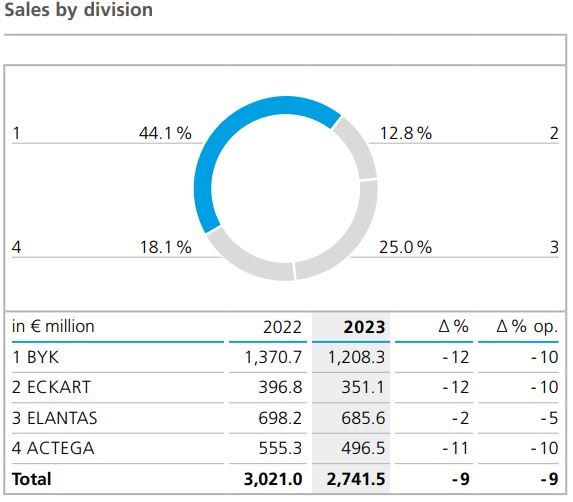 Sales in the BYK division fell by 12 % or € 162.3 million to € 1,208.3 million in the 2023 fiscal year (previous year:€ 1,370.7 million). This figure included negative exchangerate effects of € 25.5 million and positive effects of € 3.6 million from the acquisition of the business activities of Imaginant Inc. in Rochester, New York, on August 15, 2023. Adjusted for this effect, operating sales were down 10 % on the previous year.
