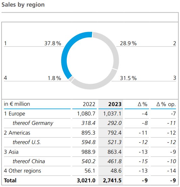 At regional level, sales performance in 2023 declined in all key markets. Europe, the region with the highest sales and Germany as the leading market, recorded a loss in the upper single-digit percentage range adjusted for exchange-rate effects. Asia achieved operating growth, particularly in the markets of Japan and South Korea. Demand declined in all other markets, especially in China, the market with the highest sales, and the entire region suffered sales losses in the low double-digit percentage range after adjusting for foreign exchange. The Americas, which showed the greatest sales momentum in the previous year, faced the biggest percentage loss in 2023 after exchange-rate adjustments. The decline in sales was evident in all markets in the region, resulting in an overall operating sales drop in the low double-digit percentage range, mainly due to the development in the U.S., the market with the highest sales. The markets in Canada, Brazil, and Mexico showed disproportionately weak momentum in 2023, with exchange-rate-adjusted sales decreases of over 20 % in some cases.