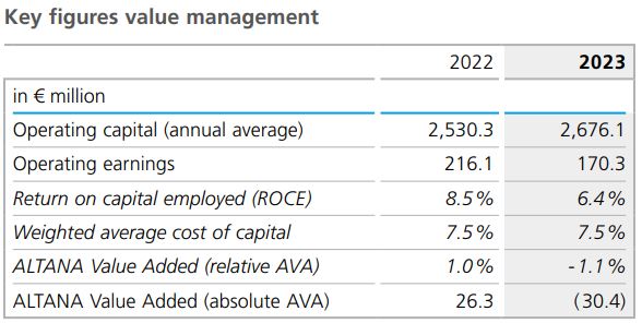ALTANA’s earnings development in 2023 was reflected in the operating margins of € 170.3 million (previous year: € 216.1 million). The earnings components for the year, particularly those of the Von Roll Group, were impacted by extensive acquisition and integration costs as well as one-off negative effects from the revaluation of acquired inventories. Overall, the aforementioned influences on EBIT led to a relatively low earnings base compared to increased operating capital. The cost of capital rate remained unchanged at 7.5 %, resulting in costs of capital of € 200.7 million (previous year: € 189.8 million).