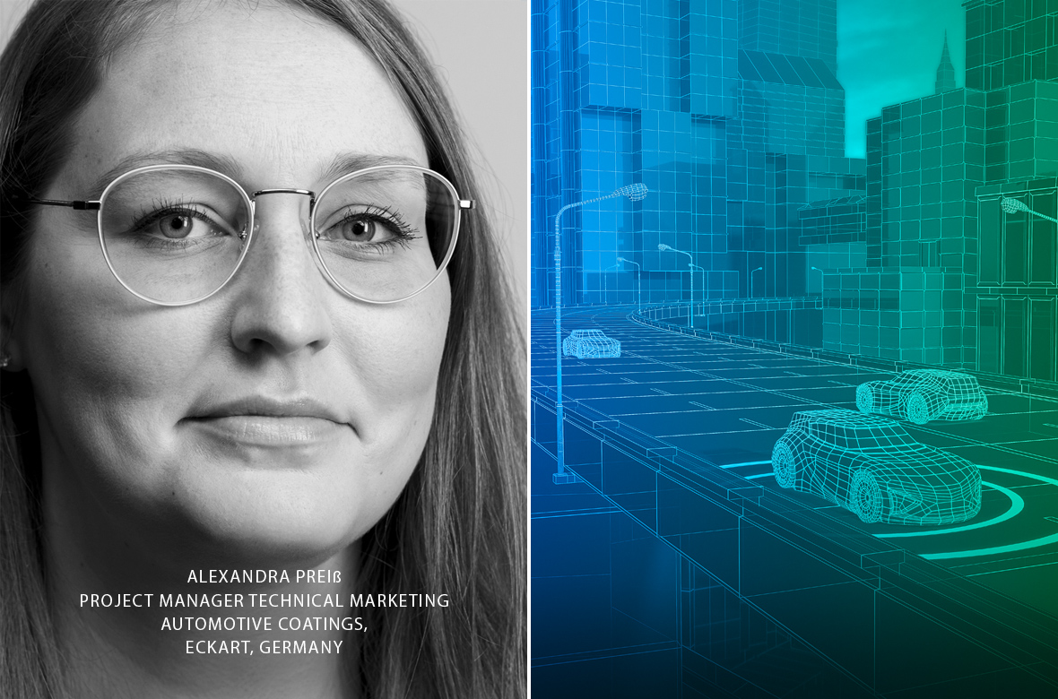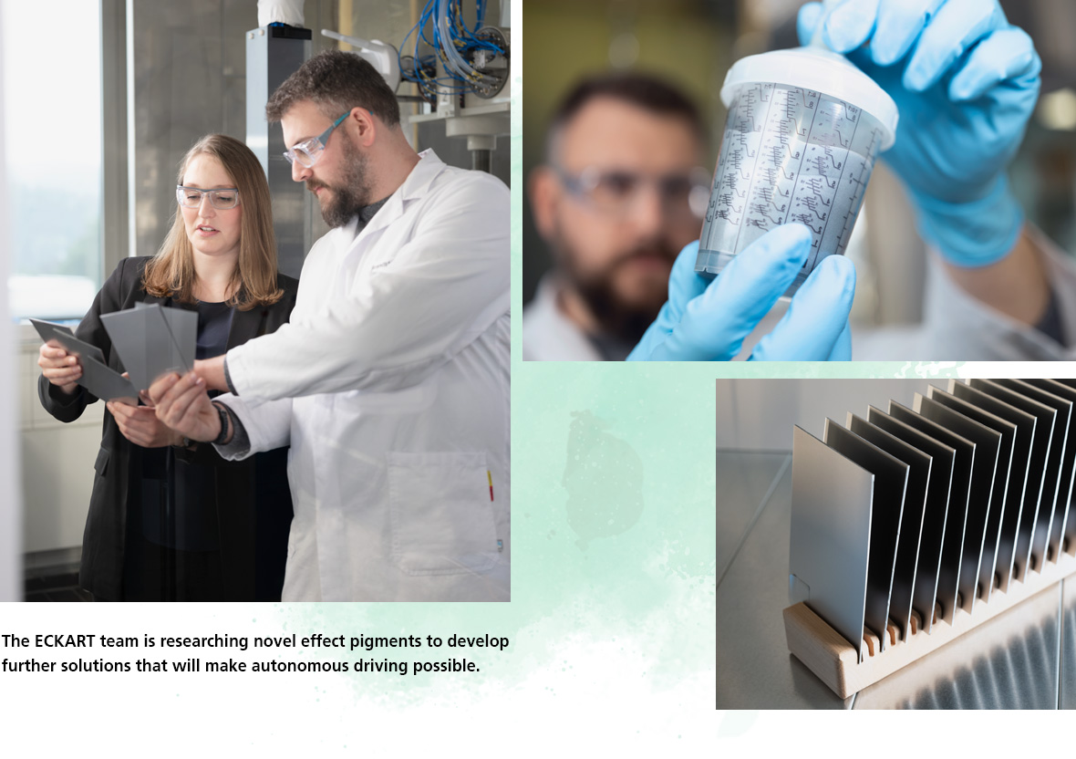 LOOKING AHEAD, further advancements are necessary for fully autonomous passenger transport. The prevalence of sensors in cars is anticipated to rise. ECKART’s experts are dedicated to ongoing research into innovative effect pigments, collaborating with customers to find application technology solutions that offer a high degree of formulation freedom and flexibility for autonomous driving. Sustainability is a key focus in product development and manufacturing, forming the third pillar alongside functionality and appearance. The pigments are designed to enable resource-efficient and long-lasting use, whether under high temperatures with ample sunshine, in tropical climates with high humidity, or facing icy winds and snowfall in the winter.